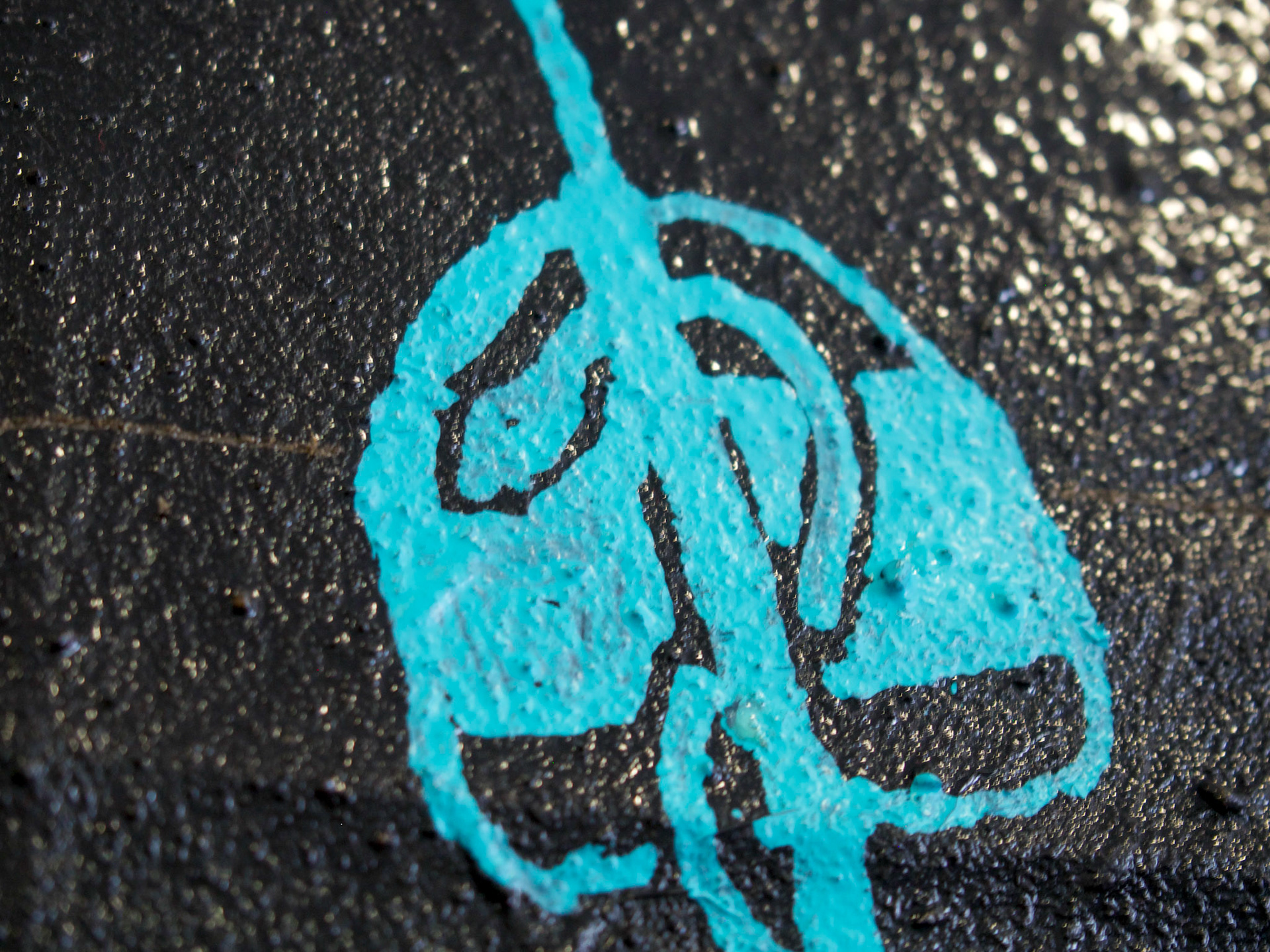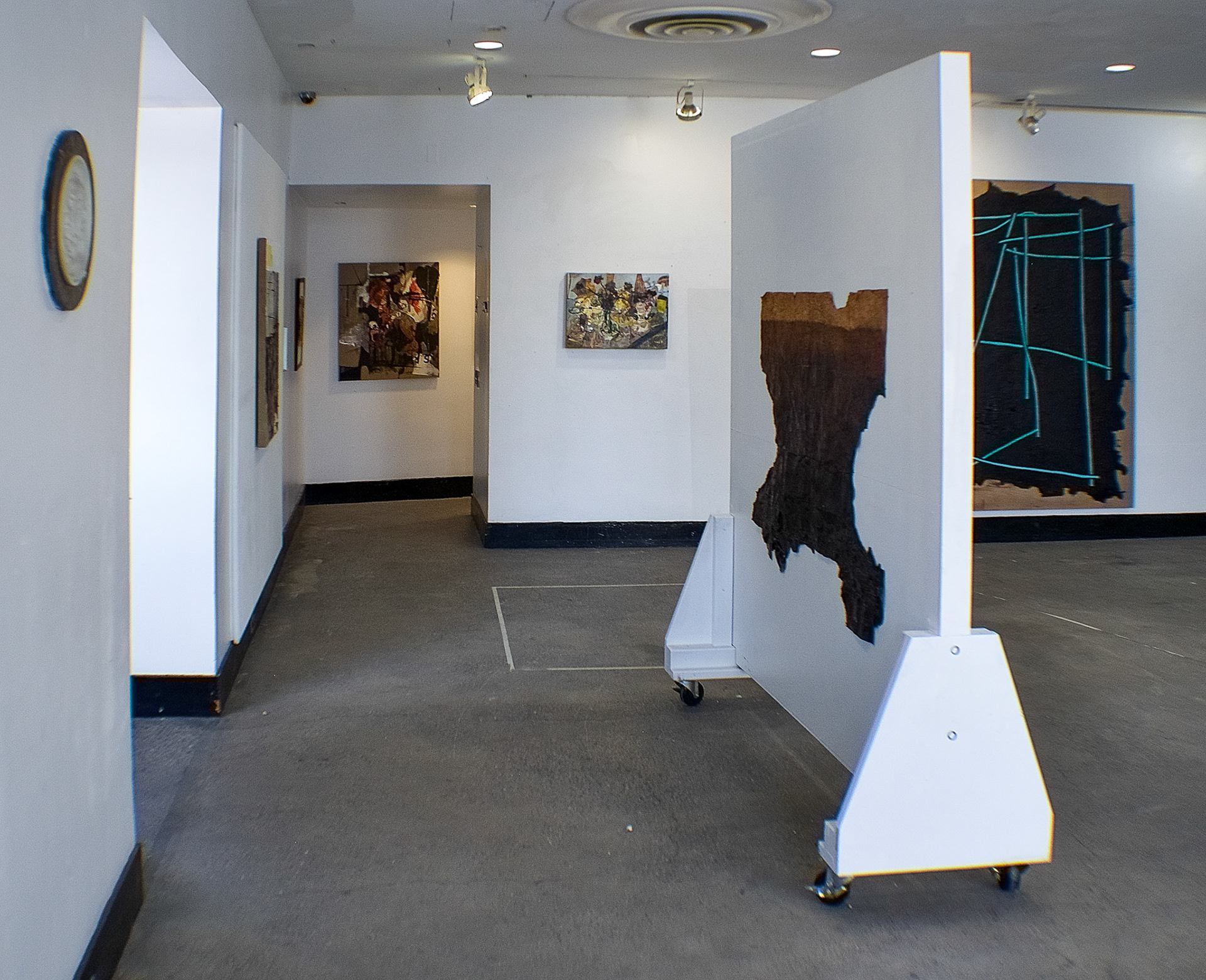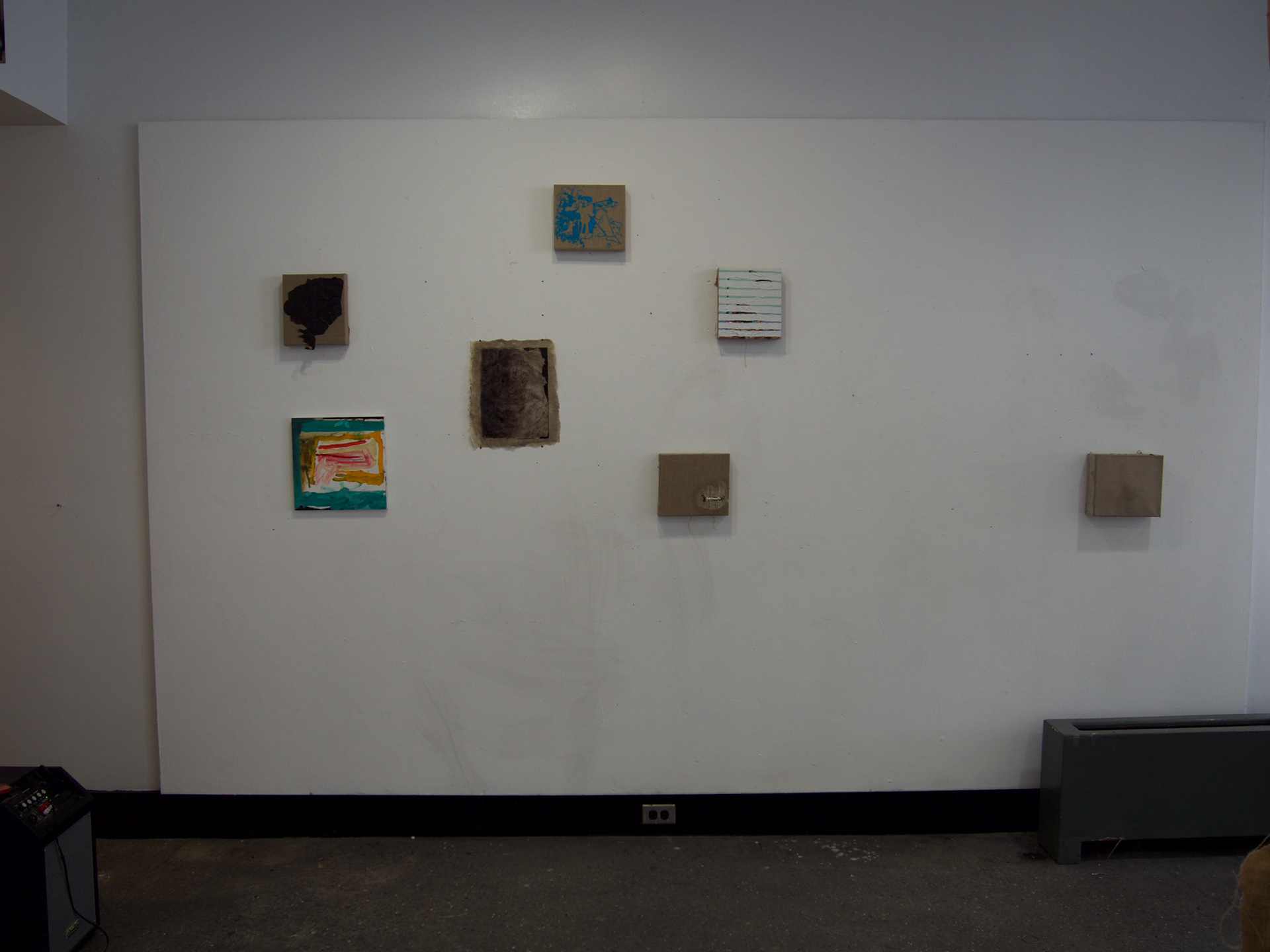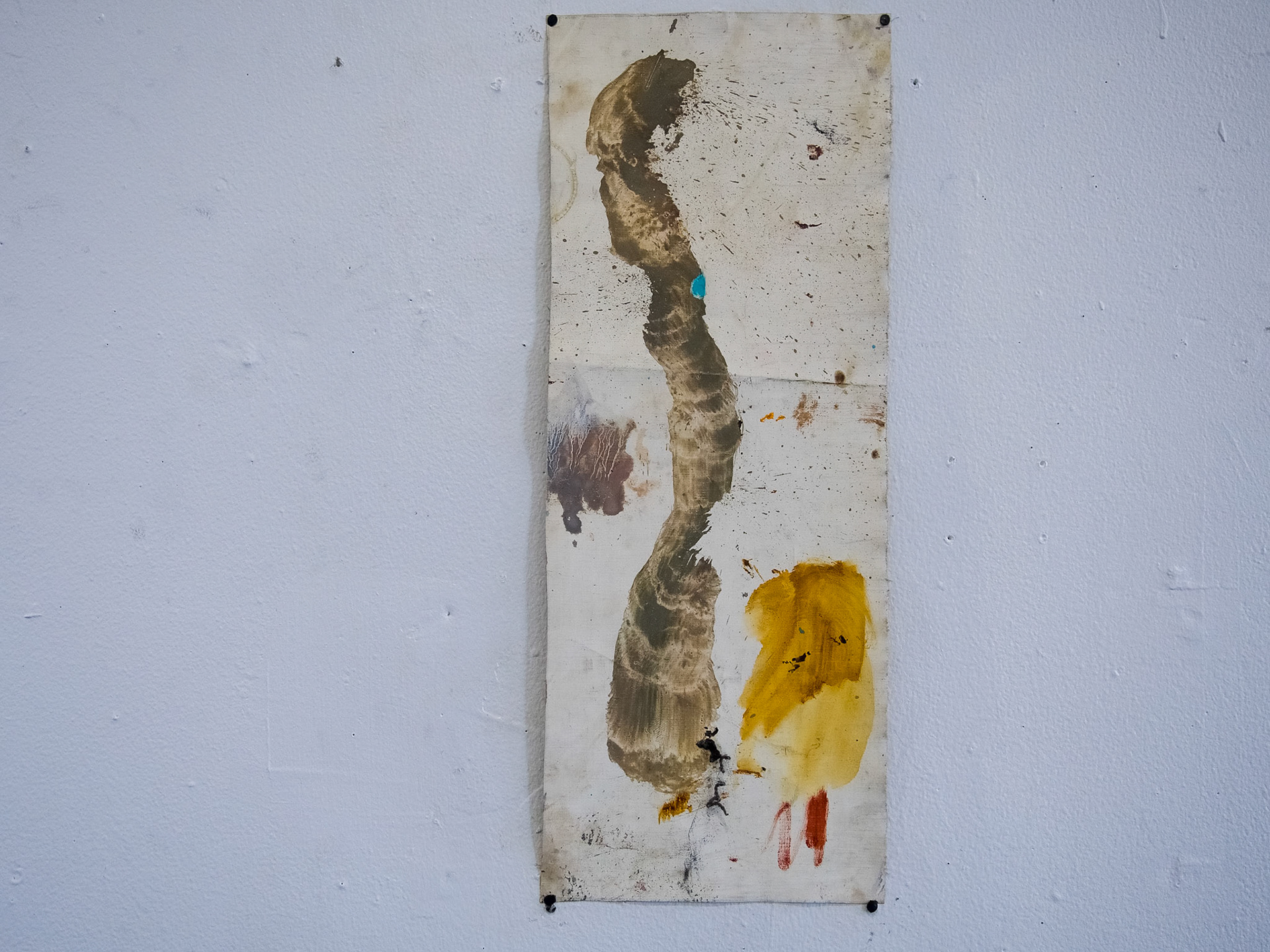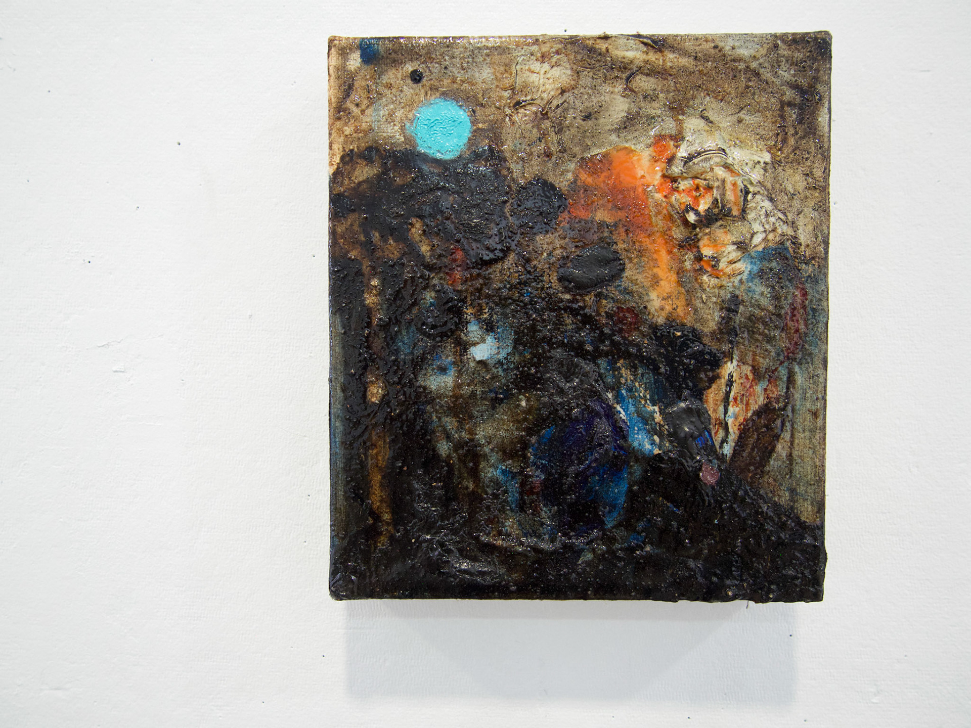 An innocuous slinky in colorful garb,This robot can sidewind anywhere. 8” x 9”, Tar, Brooklyn earth on pshycward trash bag on linen